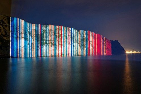 Visualisierung der Erderwärmung: Kreidefelsen erleuchten mit Klimastreifen